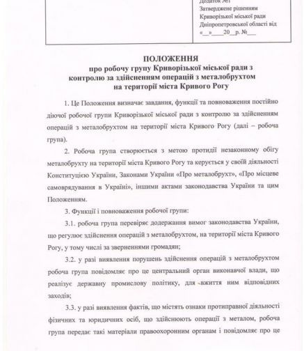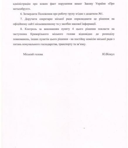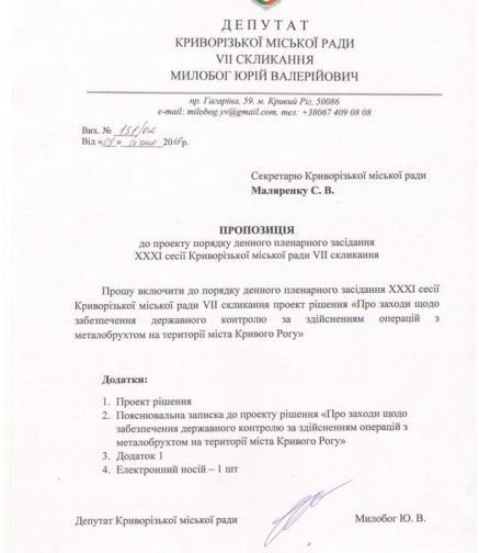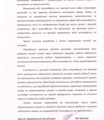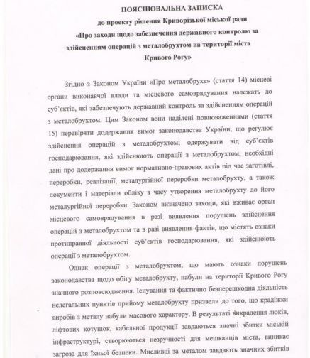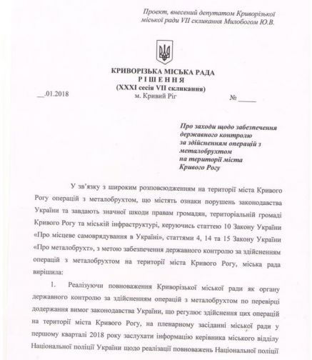 Мною на чергову сесію міської ради внесено проект рішення про заходи щодо забезпечення державного контролю за здійсненнями операцій з металобрухтом на территорії міста.