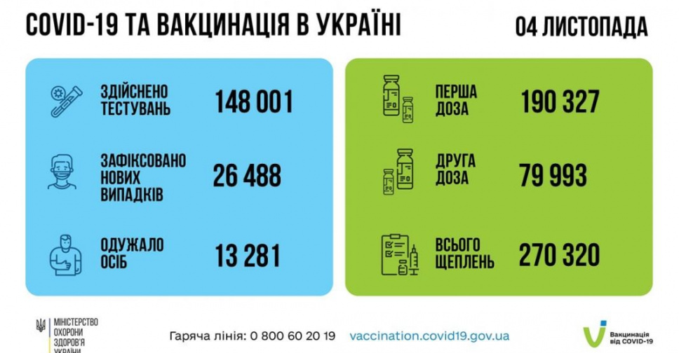 В Україні зафіксовано 3 032 951 випадок коронавірусної хвороби COVID-19. За добу було зафіксовано 26 488 нових випадків.