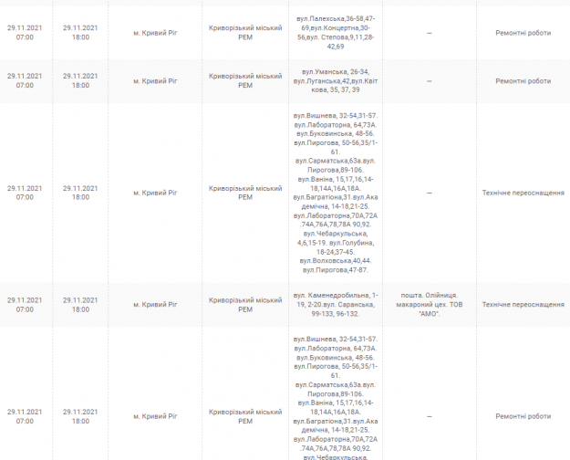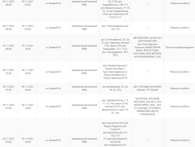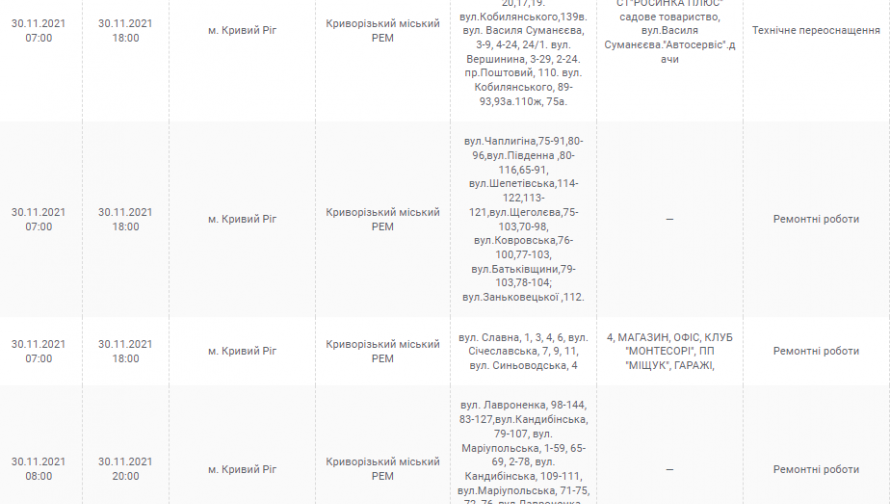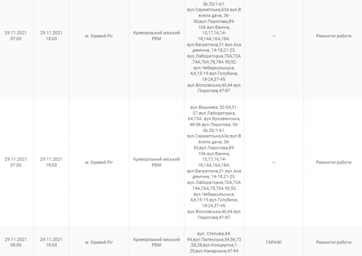29 та 30 листопада 2021 року у Кривому Розі та Криворізькому районі відбудуться планові роботи, пов’язані із відключенням електроенергії. Адреси у нашій статті.