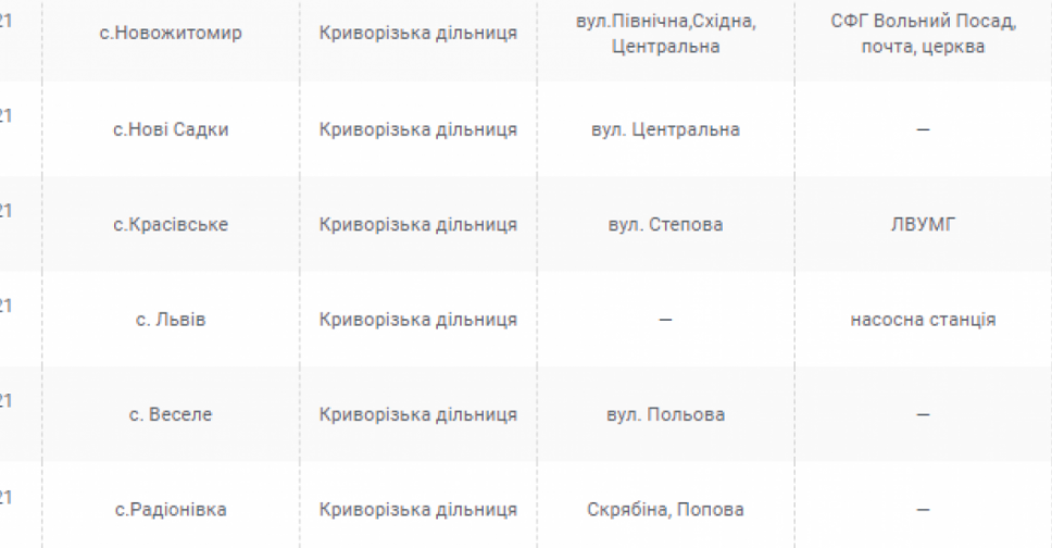 Населені пункти Криворізького району, у яких відбудеться відключення 30 листопада з 08:00 до 17:00: