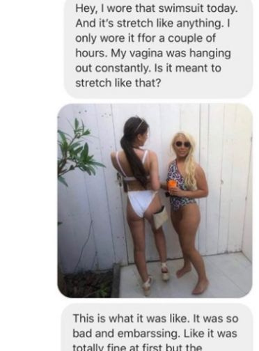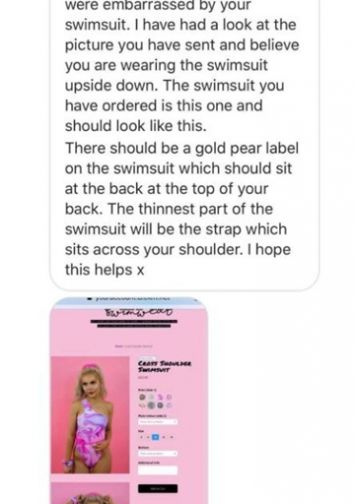 В ответ на жалобу, к которой девушка прикрепила свое фото в "неправильном" купальнике, сотрудник компании указал на то, что изделие надето неправильно. Бретельку от бюстгальтера купальника женщина использовала в качестве трусов. В конце ответа сотрудник компании написал "надеюсь, это вам поможет".