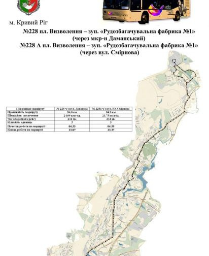 Автобусный маршрут №228: "площадь Освобождения - Рудообогатительная фабрика №1 (РОФ-1)" " через микрорайон Даманский. Начало работы маршрута в 4:59 минут.