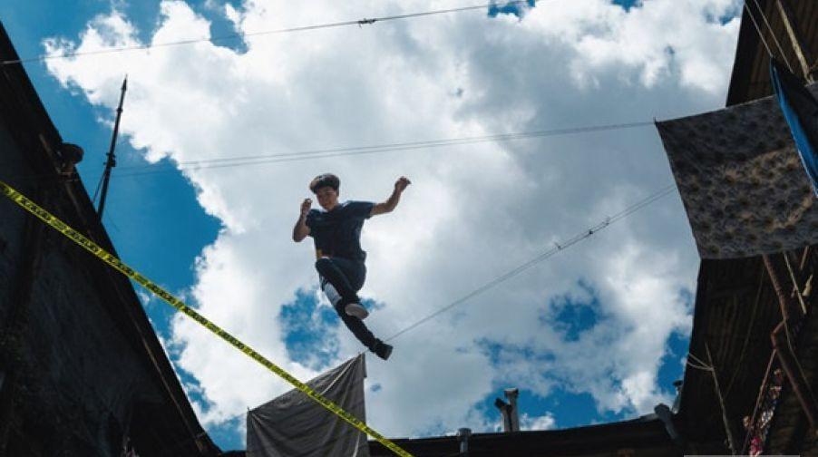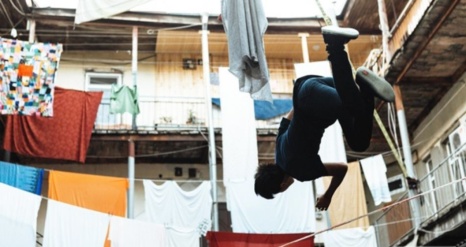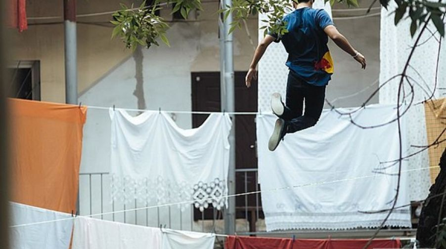 Во дворе он замечает чем-то озабоченную местную девушку и берется помогать ей. И поскольку этот турист оказался всемирно известным японским чемпионом по слеклайну, то и помогает он в очень экстремальной манере: ходит, прыгает, делает невероятные трюки и сальто на обычных веревках с бельем, которое традиционно развешано по всему дворику.
