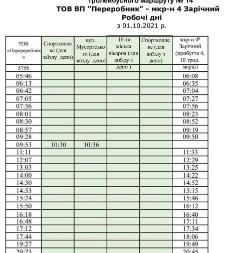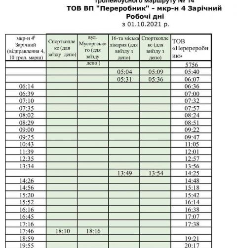 З 1-го жовтня для пасажирів тимчасово змінили графік руху тролейбуса №14. Розклад опублікували на сайті Криворізького ресурсного центру. За цим маршрутом транспорт їздить від заводу «Переробник» (Коломійцево) через вулицю Електрозаводську. Нова тимчасова кінцева зупинка – колишній кінотеатр «Зарічний» на 4-му мікрорайоні Зарічному.