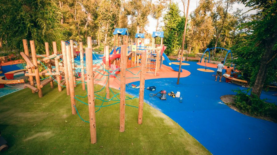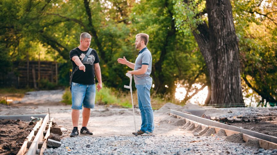 Из парка увезли строительный мусор и материалы и технику – теперь подрядчик приступил к финальному этапу работ. Работники кладут тротуарную плитку, устанавливают заграждения для парковки. Сотрудники дорожной службы закатывают асфальт, затем примутся за велодорожки.
