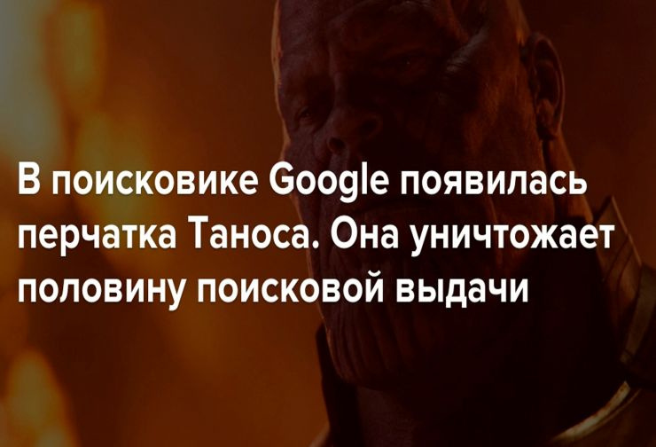 К премьере супергеройского фильма «Мстители: Финал» Google добавила в свой поисковик перчатку Таноса, главного злодея киновселенной Marvel. В предыдущей части с помощью такой перчатки он одним щелчком пальцев превратил в пыль половину живых существ во Вселенной.