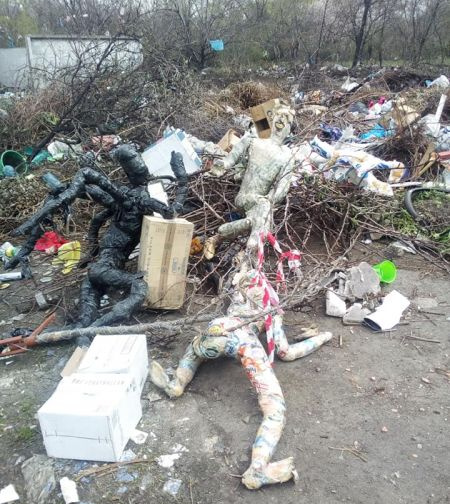 Неизвестный автор установил скульптуры в разных местах мусорника. Таких скульптурных композиций три.