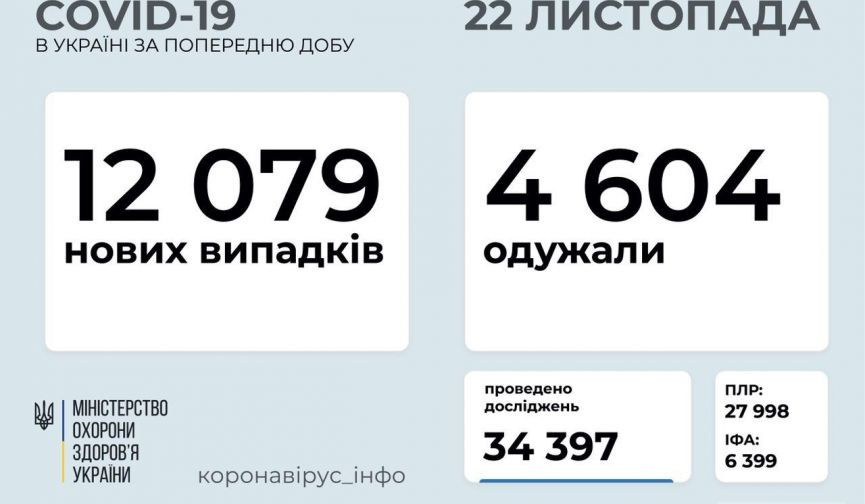 В Україні зафіксовано 12 079 нових випадків коронавірусної хвороби COVID-19. Зокрема, захворіли 489 дітей та 375 медпрацівників.