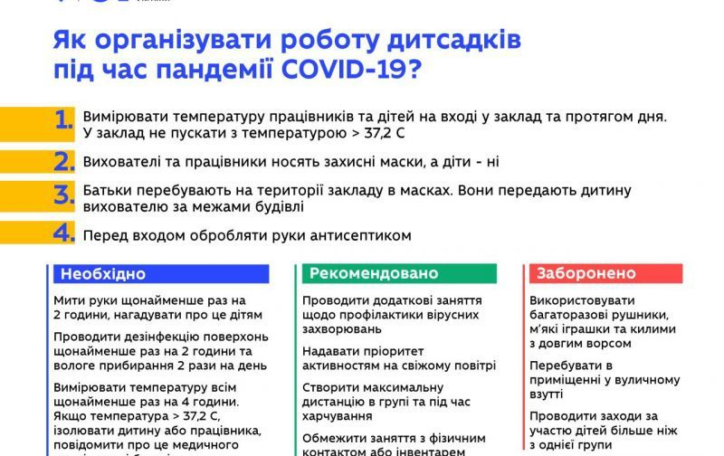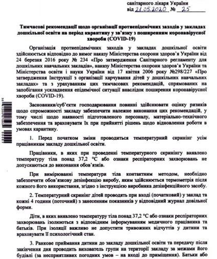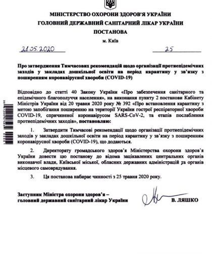 Міністерство охорони здоров’я опублікувало рекомендації щодо організації протиепідемічних заходів у закладах дошкільної освіти. Постанову затверив головний санітарний лікар України Віктор Ляшко. Документ набуває чинності з 25 травня.