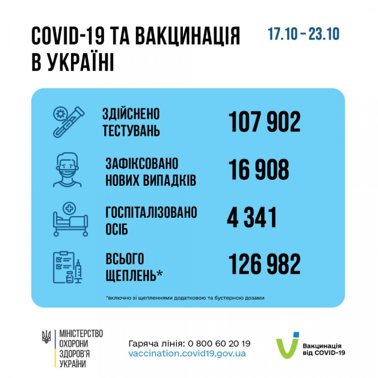 З 17 по 23 жовтня в Україні зафіксували 16 908 нових підтверджених випадків коронавірусної хвороби COVID-19, з них у дітей – 1808, медпрацівників – 303. Інформацію надали у Міністерстві охорони здоров’я України.