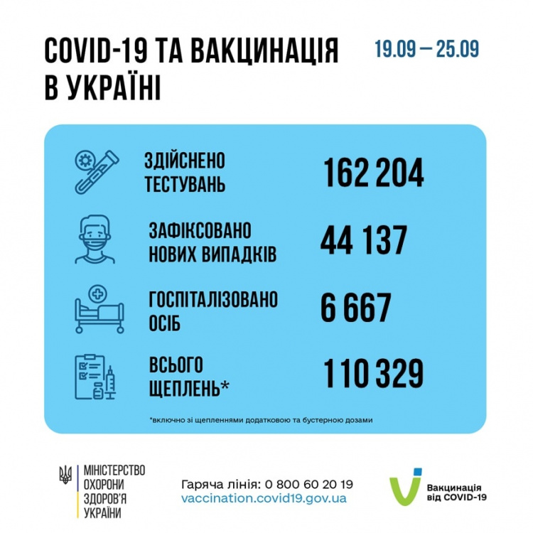 За період з 19 по 25 вересня в Україні зафіксували 44 137 нових підтверджених випадків коронавірусної хвороби COVID-19. З них 5 882 випадки підтвердили у дітей та 1 030 у медпрацівників. Статистику надали у Міністерстві охорони здоров’я України.