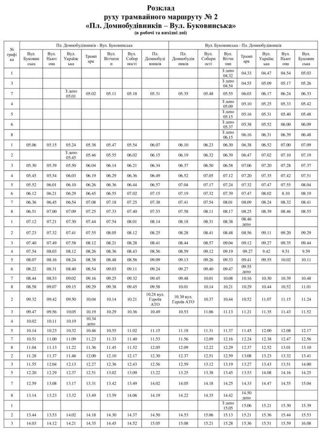 Маршрут №2 — один із найдовших у місті — охоплює низку густонаселених районів, зокрема вул. Вітчизни, вул. Ньютонa, пл. Зборності, трамвайне депо, пл. Домнобудівників та вул. Буковинську. Перші рейси стартують ще до 5:00 ранку, а інтервали між трамваями впродовж дня складають від 6 до 15 хвилин залежно від періоду.