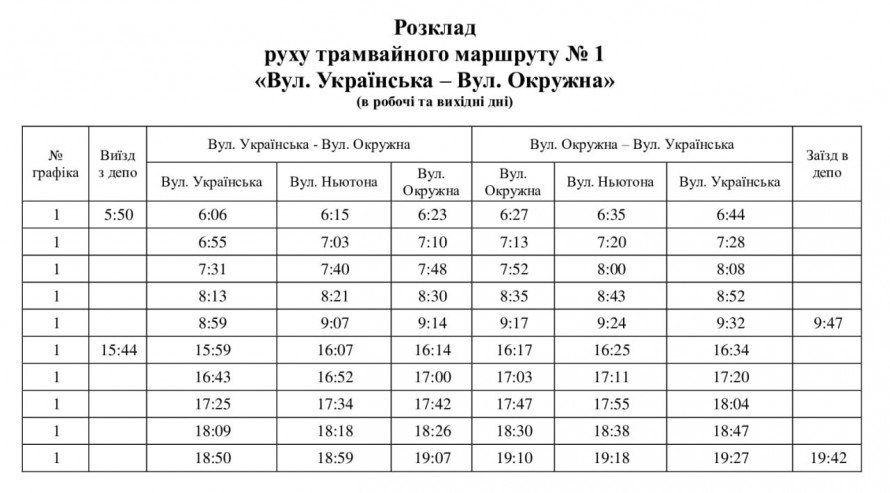 Маршрут №1 забезпечує сполучення між вул. Українською та вул. Окружною. Перший рейс вирушає з депо о 5:50, а останній — о 18:50. Трамваї курсують через ключові зупинки, зокрема вул. Ньютонa, і повертаються назад із вул. Окружної до вул. Української з 6:27 до 19:10. Графік включає точний час проходження кожної зупинки.