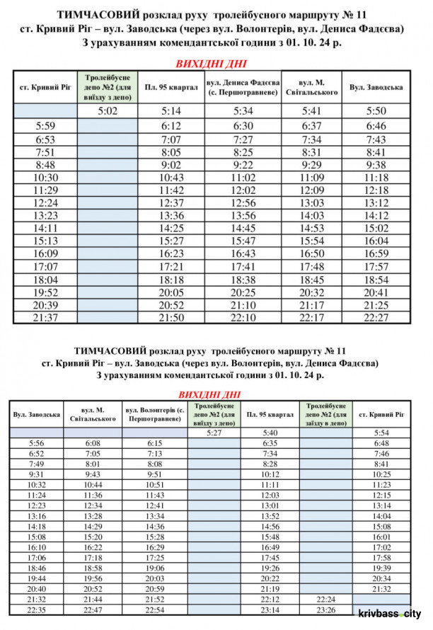 З 1 жовтня 2024 року у Кривому Розі набув чинності оновлений розклад руху тролейбуса №11. Зміни враховують дію комендантської години та адаптовані для зручності пасажирів у вихідні дні.