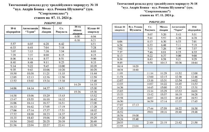 У спільноті “Транспорт Кривого Рогу” повідомили про оновлений графік руху тролейбуса №18 на робочі та вихідні дні. Пропонуємо ознайомитись із графіками тролейбусного маршруту.