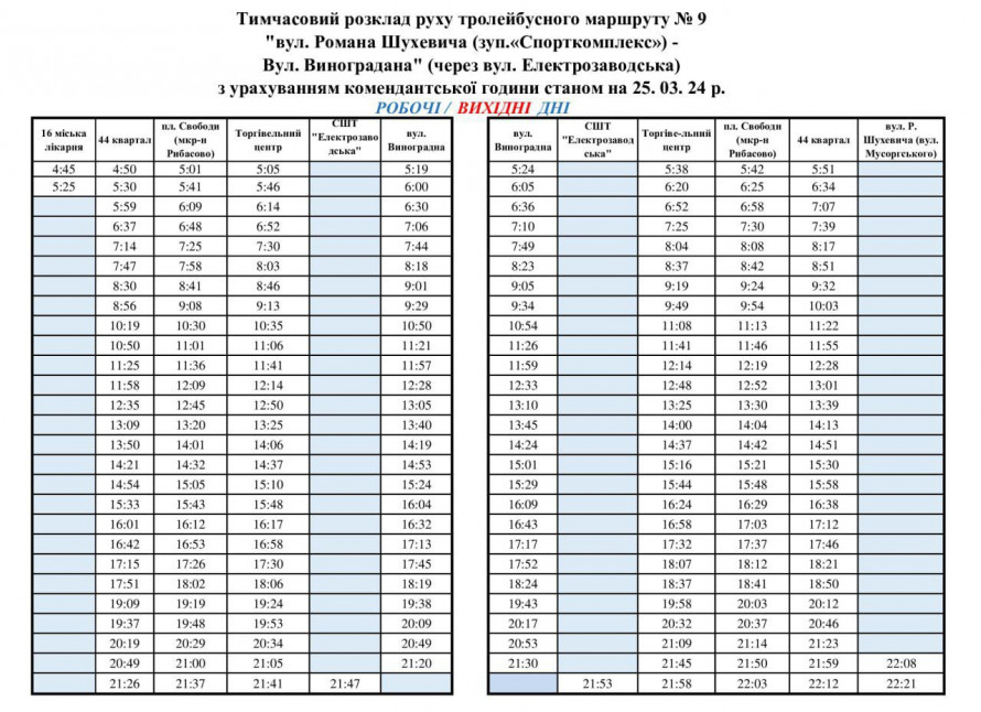 Графік руху тролейбуса №9 у вихідні та робочі дні - фото спільнота "Транспорт Кривого Рогу"