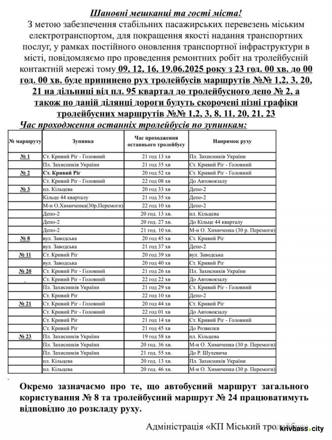 У Кривому Розі з 9 по 19 червня частково обмежать вечірній рух тролейбусів. Про це повідомили в управлінні преси криворізького міськвиконкому.