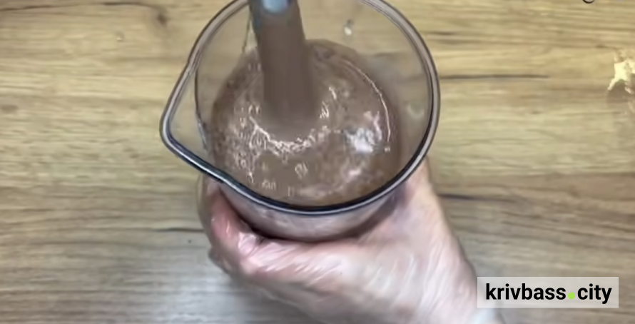 - Набухлий желатин обережно розтопіть (у мікрохвильовці або на водяній бані) та тонкою цівкою введіть у шоколадну суміш, ще раз швидко перебивши блендером.