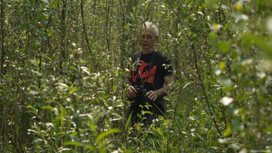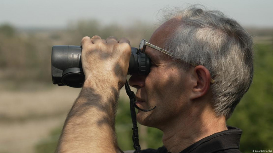 У бінокль еколог Вадим Манюк спостерігає за тваринним світом дна колишнього Каховського водосховища - фото Iryna Ukhina/DW