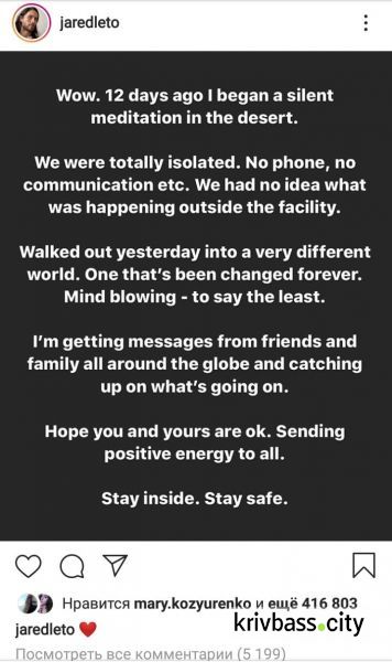 Фронтмен відомої музичної групи Thirty Seconds To Mars, Джаред Лето, 17 березня тільки дізнався про поширення вірусу COVID-19 на планеті. Причина – медитація у пустелі.
