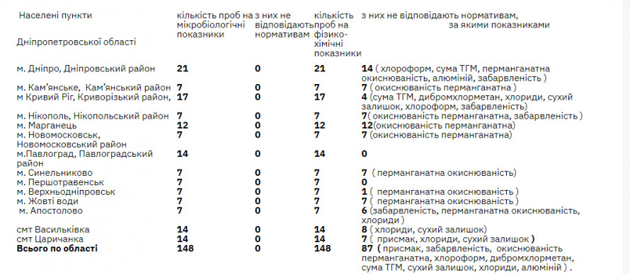 Усього дослідили 148 проб з різних джерел водопостачання регіону у період з 31 січня по 6 лютого 2025 року. Деякі результати досліджень, проведених Дніпропетровським обласним центром контролю та профілактики хвороб, викликають занепокоєння.