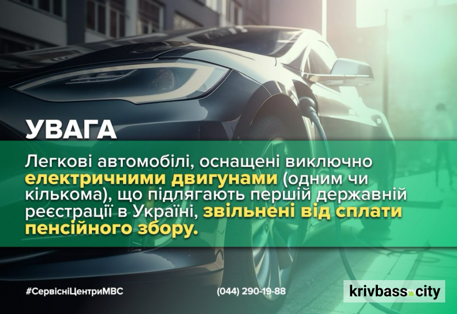 Згідно з чинним законодавством, автомобілі, оснащені виключно електричними двигунами, звільнені від сплати пенсійного збору під час першої реєстрації. Відповідна норма залишається без змін.