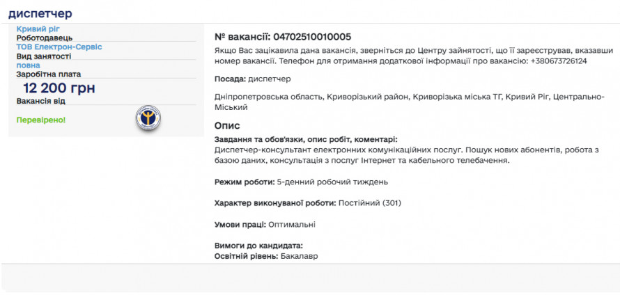- Усім, кого зацікавила ця пропозиція, радять звернутися до криворізького районного Центру зайнятості, що її зареєстрував, вказавши номер вакансії: № 04702510010005.