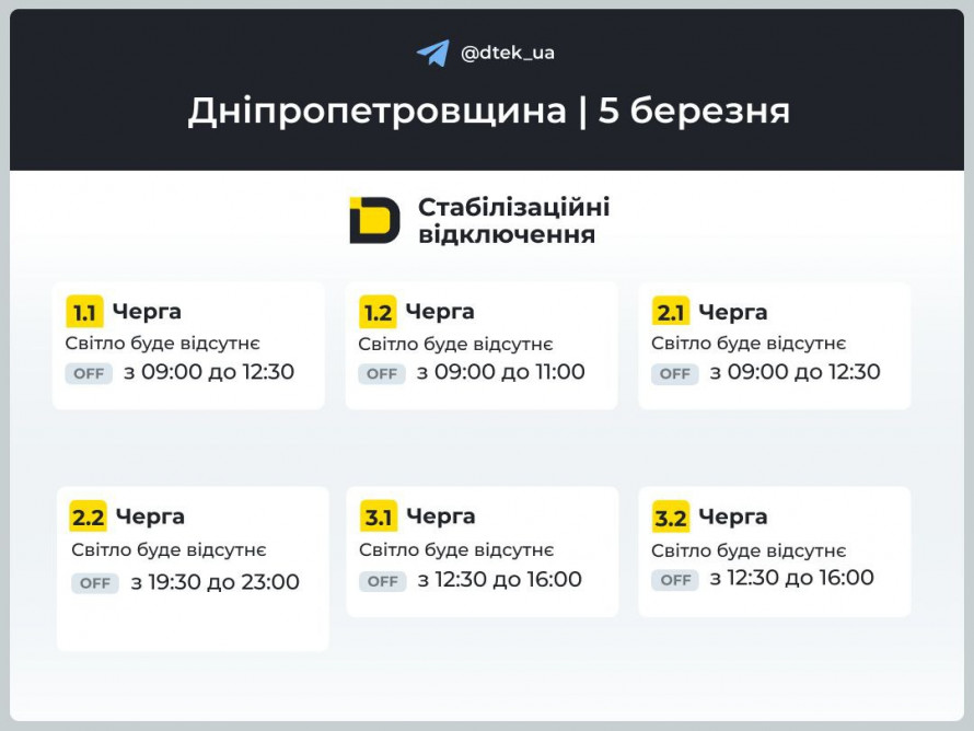 Через постійні масовані атаки російської федерації в українській енергетиці діє режим надзвичайної ситуації.За інформацією фахівців ДТЕК, для побутових споживачів Дніпропетровщини будуть застосовуватися графіки стабілізаційних відключень світла. Обмеження будуть скасовані, як тільки ситуація стабілізується.