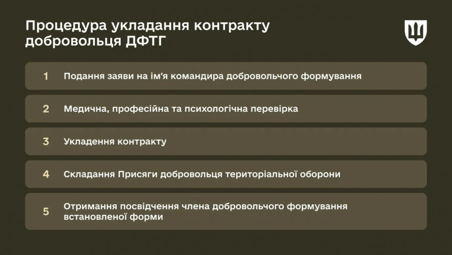- Укладення контракту. Після ухвалення рішення командиром добровольчого формування про зарахування до членства з особою укладається контракт добровольця територіальної оборони. Контракт укладається за формою, затвердженою Наказом Міністерства оборони України № 84 від 07.03.2022 року.