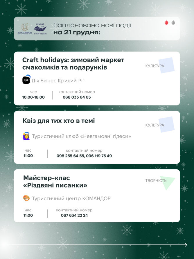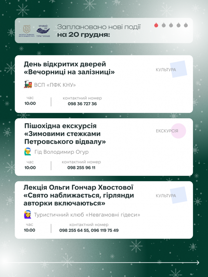 У Кривому Розі 20 та 21 грудня на різних локаціях міста заплановано понад два десятки культурних, туристичних і творчих подій. Про це журналістам krivbass.city повідомили в спільноті «Кривий Ріг туристичний».