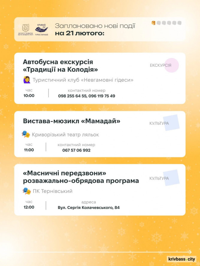 Об 11:00 у Криворізькому театрі ляльок відбудеться вистава-мюзикл «Мамадай». А вже опівдні у ПК «Тернівський» глядачів запрошують на розважально-обрядову програму «Масничні передзвони».