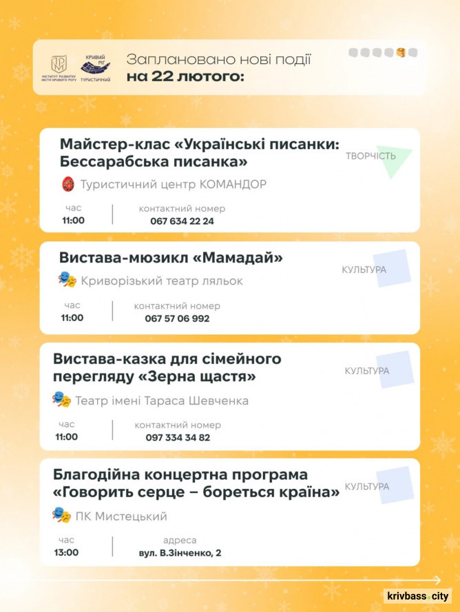 У Кривому Розі на 21 та 22 лютого заплановано низку культурних, творчих та пізнавальних подій. Мешканців і гостей міста запрошують на екскурсії, театральні вистави, концерти, майстер-класи та благодійні програми.
