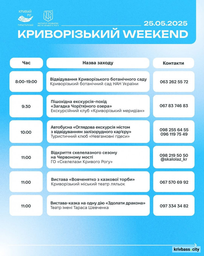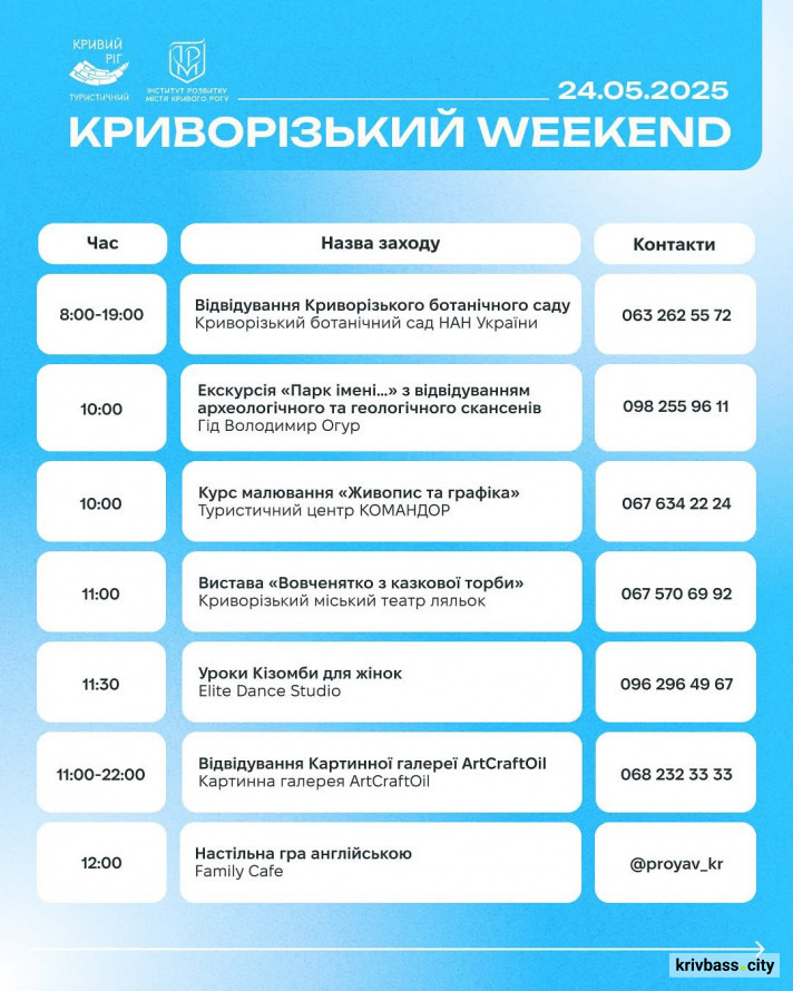 Цими вихідними, 24 та 25 травня, у Кривому Розі відбудеться серія культурних, туристичних та освітніх подій. Про це журналістам krivbass.city повідомили в спільноті «Кривий Ріг туристичний».