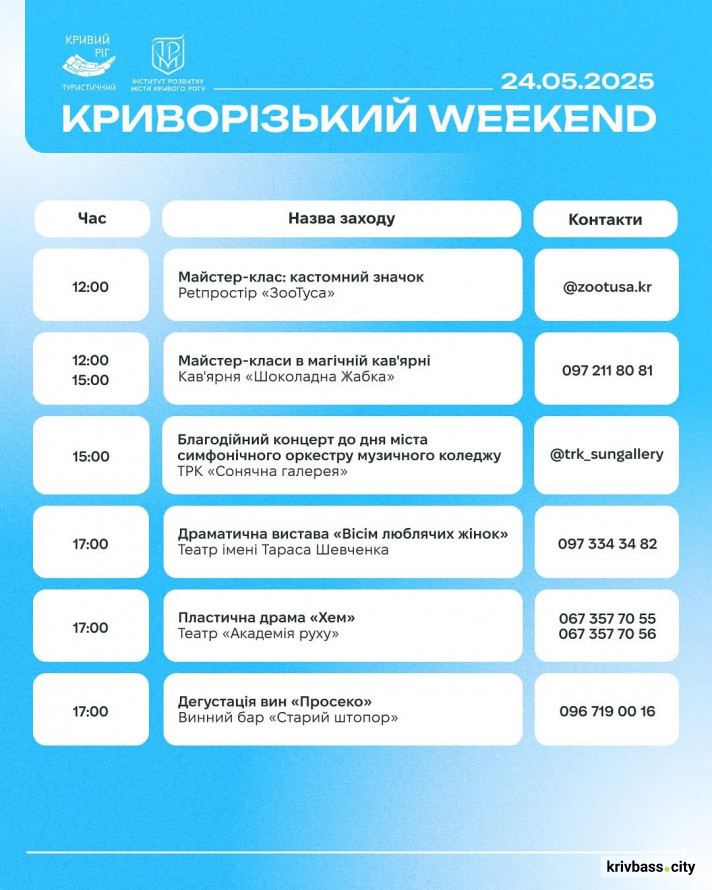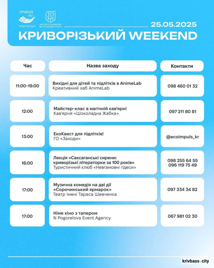 Криворіжців та гостів міста закликають заздалегідь реєструватися на події та уточнювати деталі за вказаними контактами. Участь у більшості заходів безкоштовна.