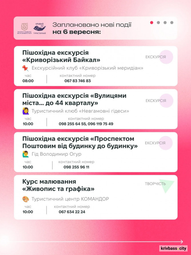 У суботу, 6 вересня, на криворіжців чекають одразу кілька пішохідних екскурсій: «Криворізький Байкал», «Вулицями міста… до 44 кварталу», «Проспектом Поштовим від будинку до будинку» та прогулянка парком імені Федора Мершавцева.