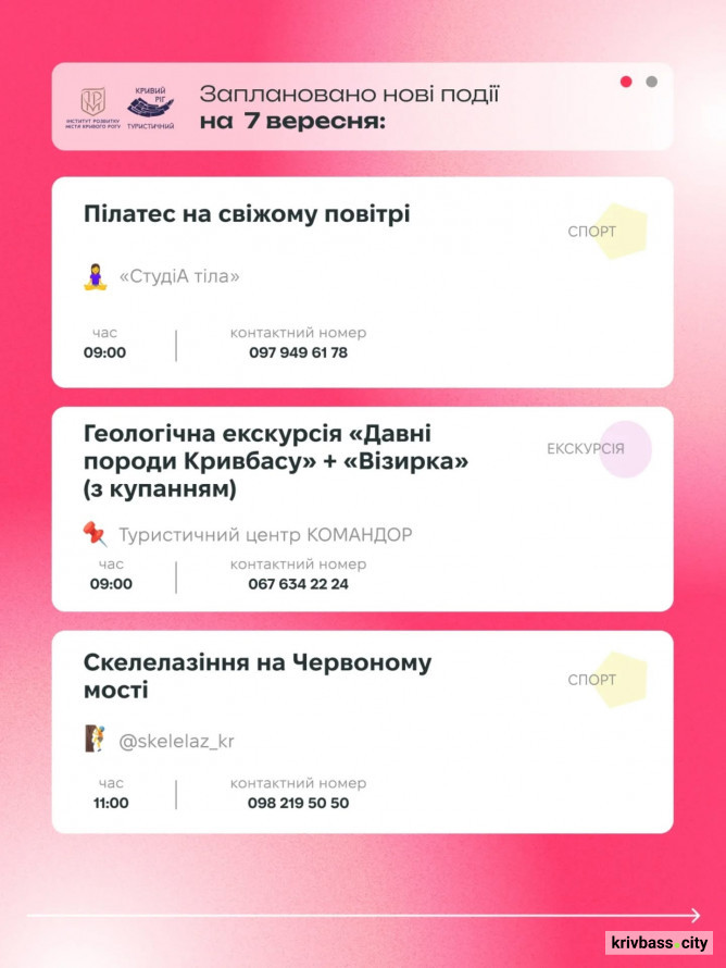 6 і 7 вересня у Кривому Розі відбудеться низка культурних та спортивних подій, які подарують мешканцям та гостям міста насичені й різнопланові вихідні. Про це журналістам krivbass.city повідомили в спільноті «Кривий Ріг туристичний».