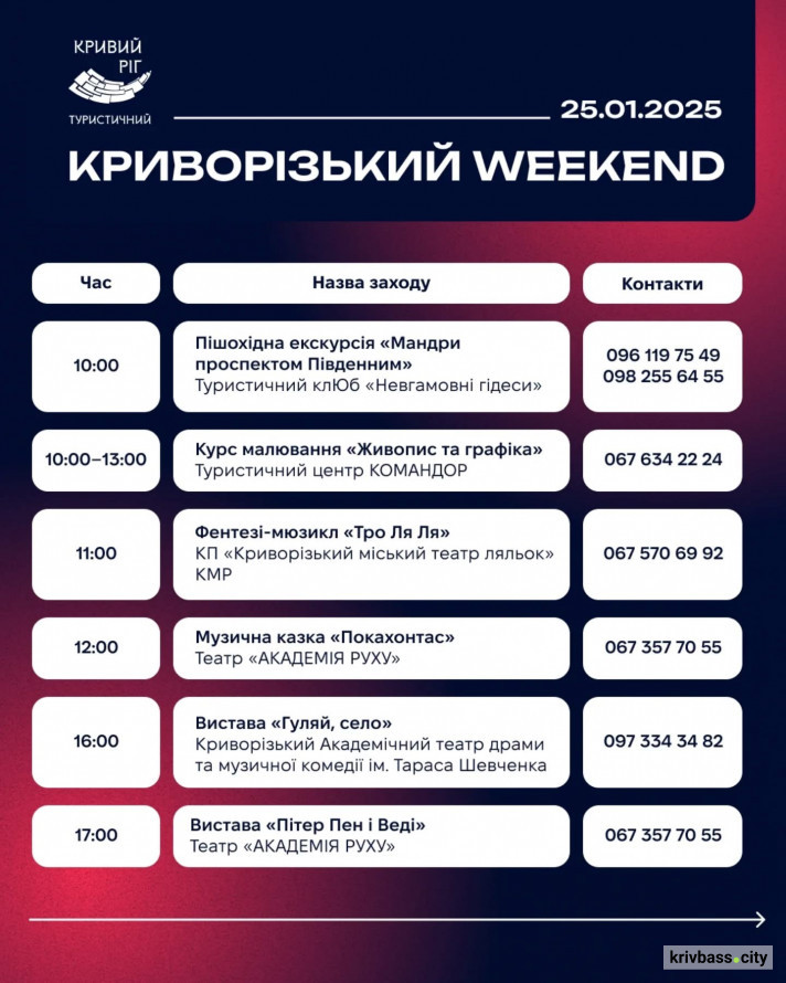 Цими вихідними, 25 та 26 січня, у Кривому Розі запрошть містян і гостей поринути в атмосферу культурного різноманіття, творчості та відпочинку.