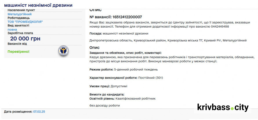 - Усім, кого зацікавила ця пропозиція радять звернутися до криворізького районного Центру зайнятості, що її зареєстрував, вказавши номер вакансії: № 16512412200007.