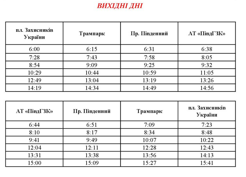З АТ "ПівдГЗК" у робочі дні перший рейс – о 06:28, останній – о 20:51.