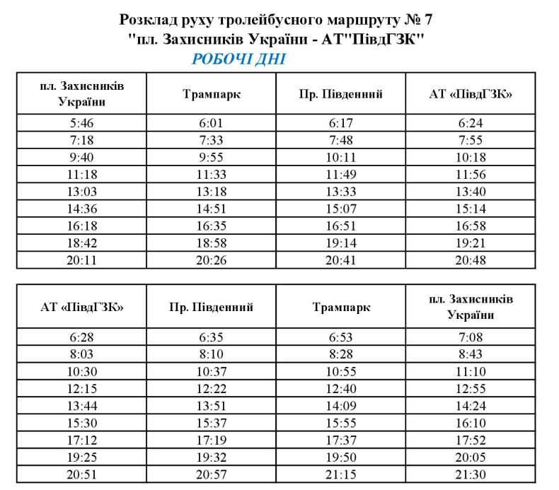 У спільноті “Транспорт Кривого Рогу” оприлюднили оновлений графік руху тролейбуса №7 на вихідні та робочі дні. Пропонуємо ознайомитись із графіками тролейбусного маршруту з урахуванням комендантської години.