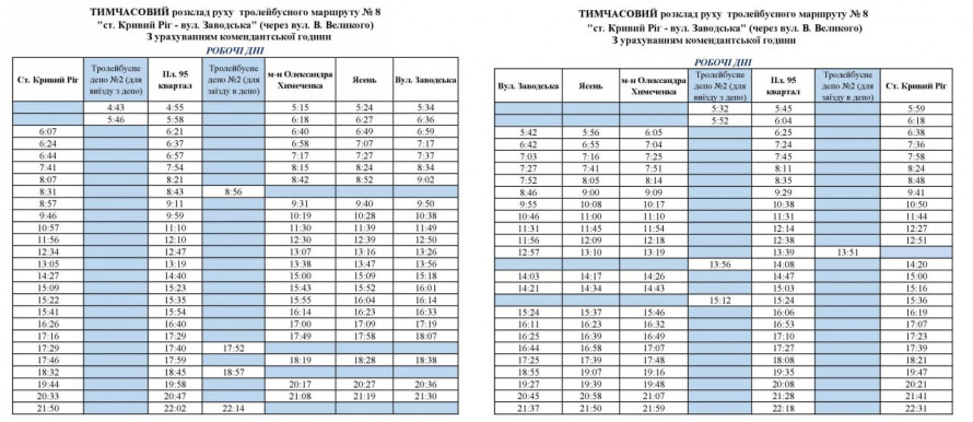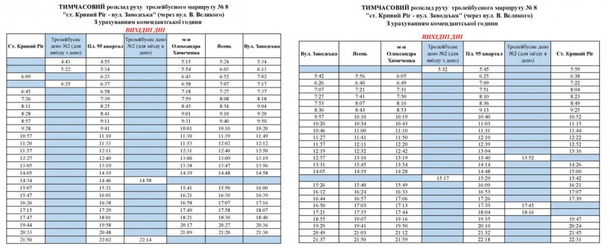 У спільноті “Транспорт Кривого Рогу” оприлюднили оновлений графік руху тролейбуса №8 на вихідні та робочі дні. Пропонуємо ознайомитись із графіками тролейбусного маршруту з урахуванням комендантської години.