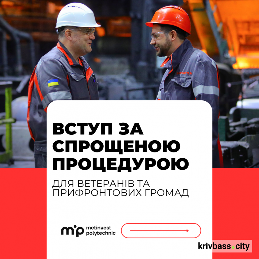 Технічний університет «Метінвест Політехніка» оголосив про старт вступної кампанії за спрощеною процедурою для ветеранів і ветеранок, а також для осіб, зареєстрованих у населених пунктах, які належать до територій активних бойових дій. Вступникам з цих категорій не потрібно складати національний мультипредметний тест. Для вступу достатньо пройти онлайн-співбесіду. Про це повідомляють у пресслужбі компанії.
