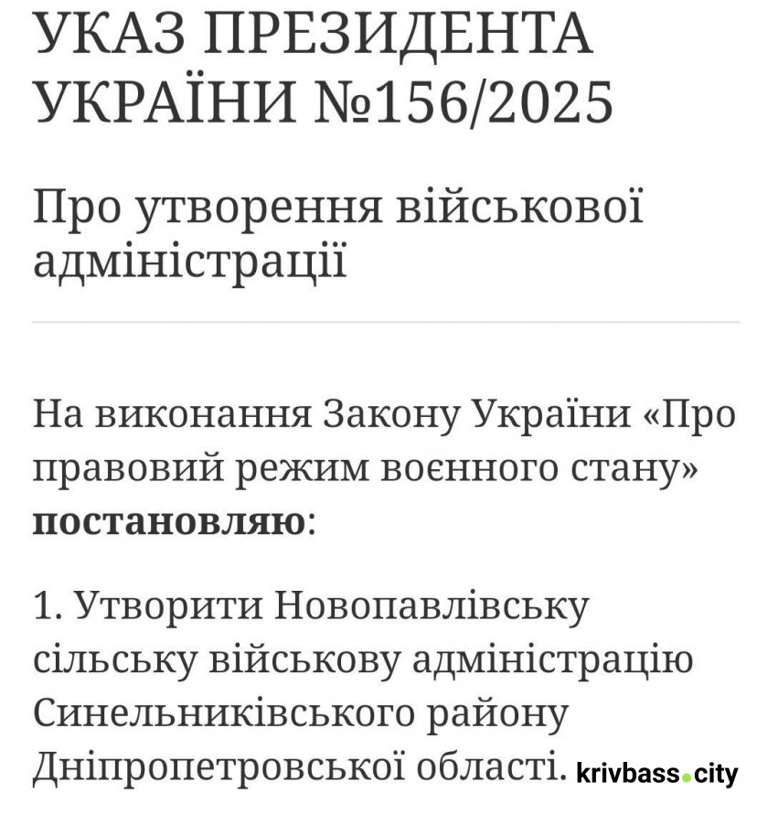 Президент України Володимир Зеленський 7 березня підписав указ про створення Новопавлівської військової адміністрації на Дніпропетровщині. Про це повідомили в пресслужбі Дніпропетровської ОВА.