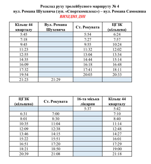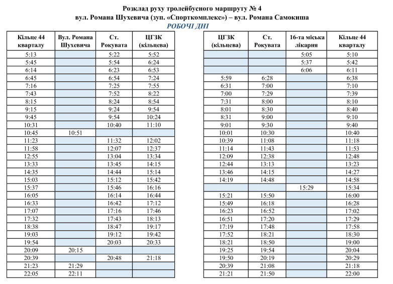 У спільноті “Транспорт Кривого Рогу” оприлюднили змінений графік руху тролейбуса №4 на робочі та вихідні дні. Пропонуємо ознайомитись із графіками тролейбусного маршруту.