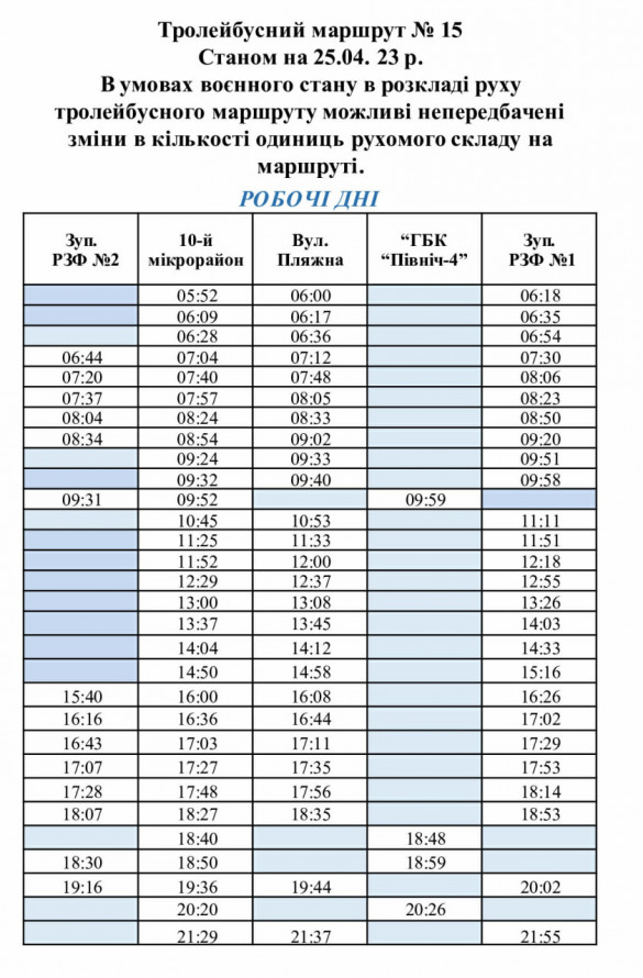 У Кривому Розі оновили графіки розкладів на тролейбусні маршрути міської лінії. Пропонуємо ознайомитись із графіками тролейбусного маршруту №15 на вихідні та робочі дні.