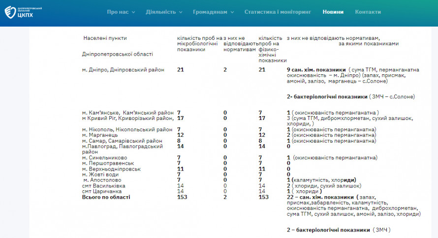 Результати досліджень стану якості питної води - скріншот сайту