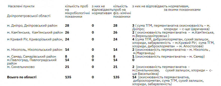 - У Кривому Розі та Криворізькому районі дослідили 24 проби води, 4з них не відповідають нормативам (сума ТГМ, дибромхлорметан, сухий залишок, хлориди, забарвленість – м.Кривий Ріг; сума ТГМ, хлориди, диброхлорметан – м. Апостолове).