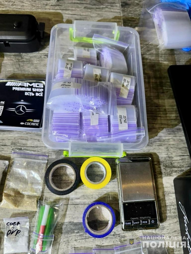 Згодом, під час обшуку квартири, яку орендував затриманий, поліцейські вилучили велику кількість підготовлених до подальшого збуту наркотичних речовин, серед яких - вакуумні пакети та згортки з марихуаною вагою понад 500 г та понад 100 сліп-пакетів з психотропами. Також у помешканні правоохоронці виявили порожні сліп-пакети, ізоляційні стрічки різноманітних кольорів, вакууматор, електронні ваги, мірні ємкості із залишками речовини рослинного походження, які чоловік використовував для пакування товару.