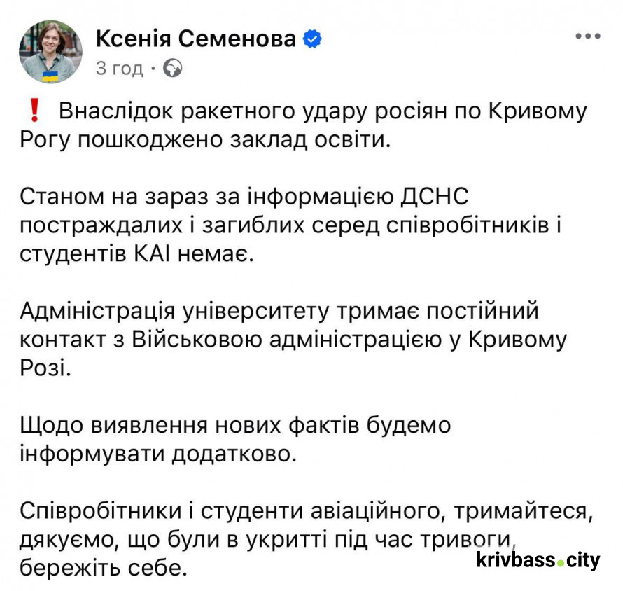 За словами ректорки КАІ загиблих і постраждалих серед працівників та студентів авіаколеджу немає.