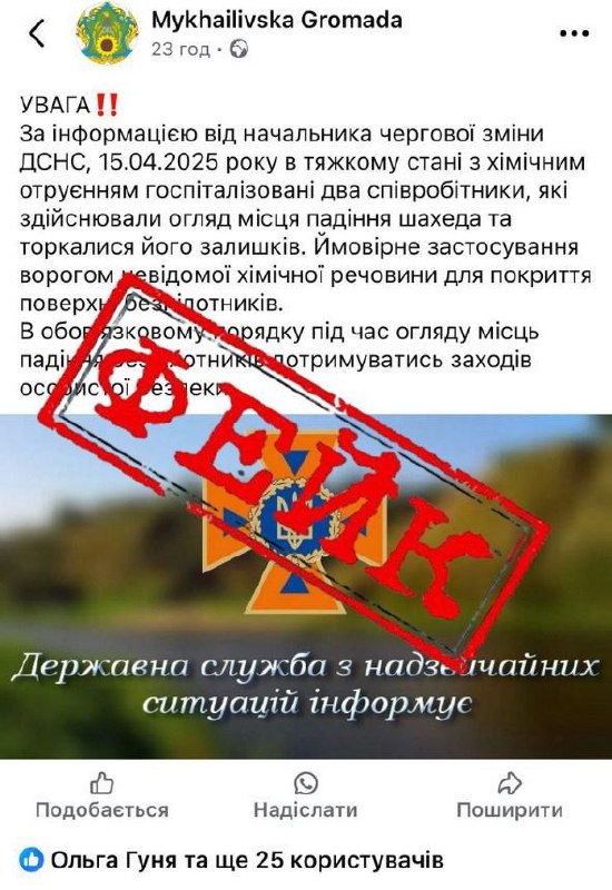 "У мережі поширюється фейкова інформація, нібито 15 квітня 2025 року двоє співробітників ДСНС у тяжкому стані з хімічним отруєнням були госпіталізовані після огляду місця падіння БПЛА (так званого “Шахеда”) на території Полтавської області", - йдеться у повідомленні.